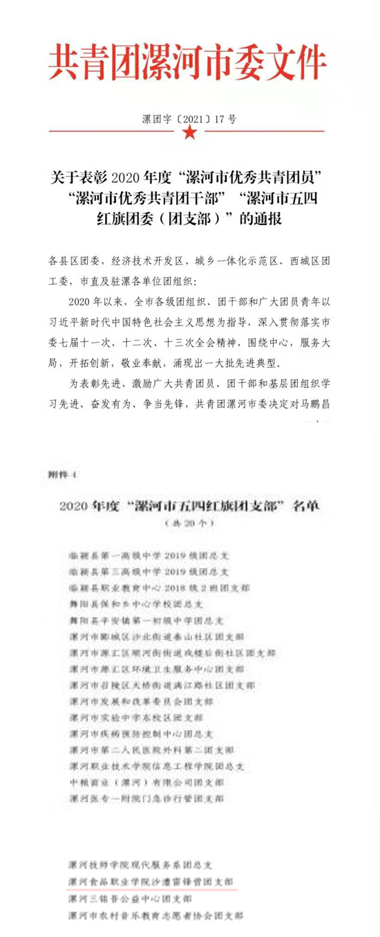2021年4月22日,共青团漯河市委揭晓了2020年度“漯河市五四红旗团委(团支部)”名单,williamhill英国官网沙澧雷锋营团总支喜获该奖项!
