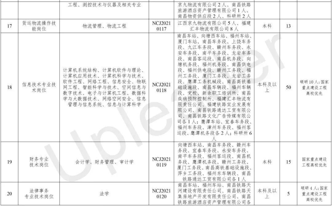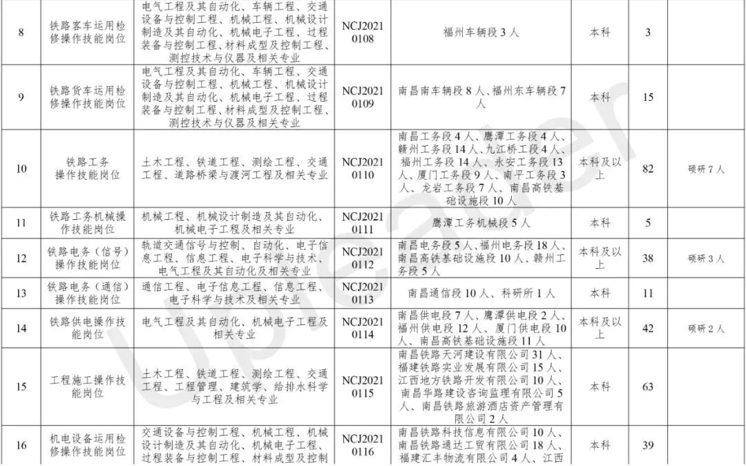 招聘计划:507人;列入国家招生计划、具备派遣资格的应届普通高等院校铁路主专业研究生和全日制本科毕业生。