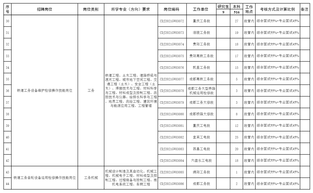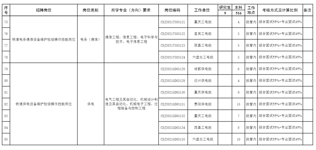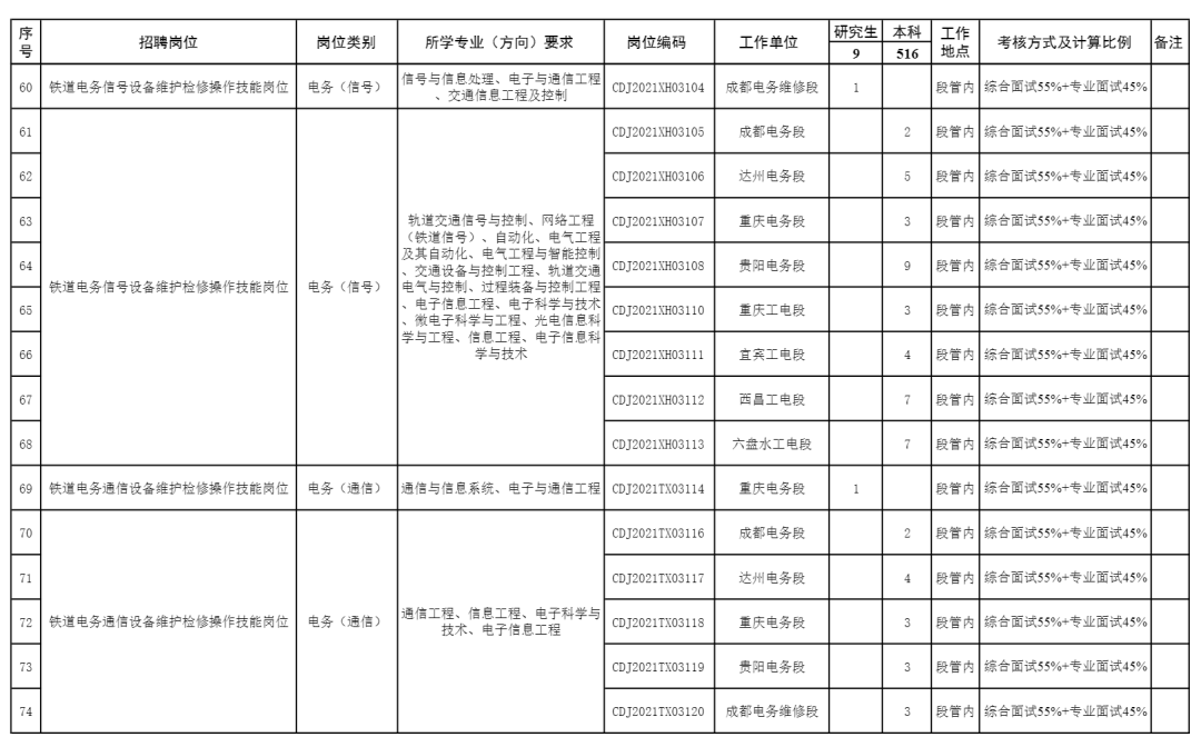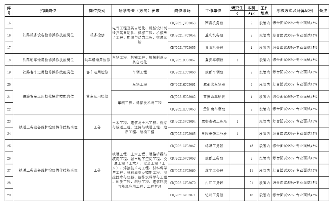 招聘岗位采取“笔试+面试”考核方式。笔试主要对应聘人员进行铁路基本知识和基本原理、公共基础知识、语文表达、数学基础、逻辑推理、英语应用能力、体质健康以及专业知识等内容的测试。