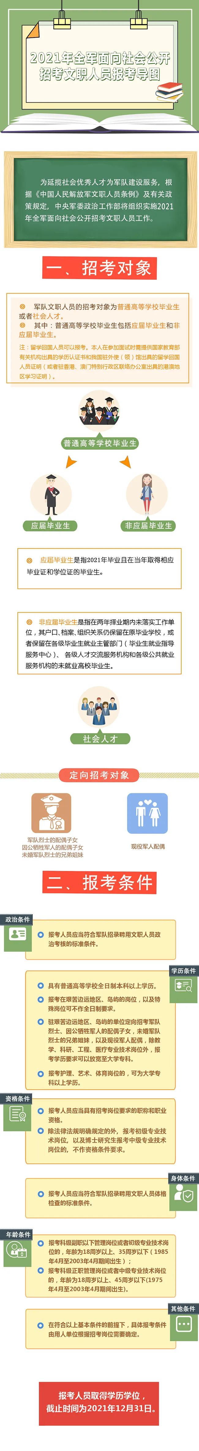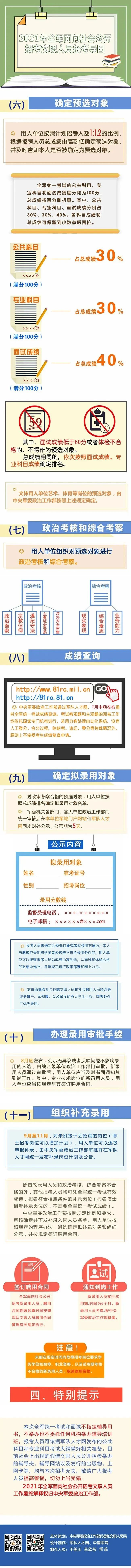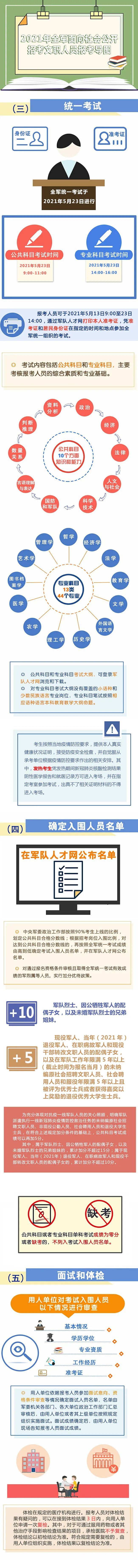 根据计划安排,报考人员可以于4月7日至13日通过军队人才网报名,5月23日全军组织统一考试,11月底前完成面试体检、政审考察、公示审批和补充录用等工作。这次公开招考,适应军队改革和部队建设需要,适度扩大招考数量,加大对军队烈士亲属的优待力度,对文体岗位实行先面试后笔试,通过完善制度机制,优化程序办法,强化监督服务,落实疫情常态化防控要求,进一步提高人才引进质量效益,确保招考工作安全规范、公平公正、顺利圆满。