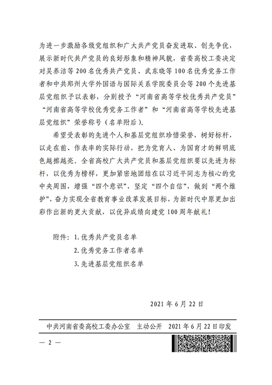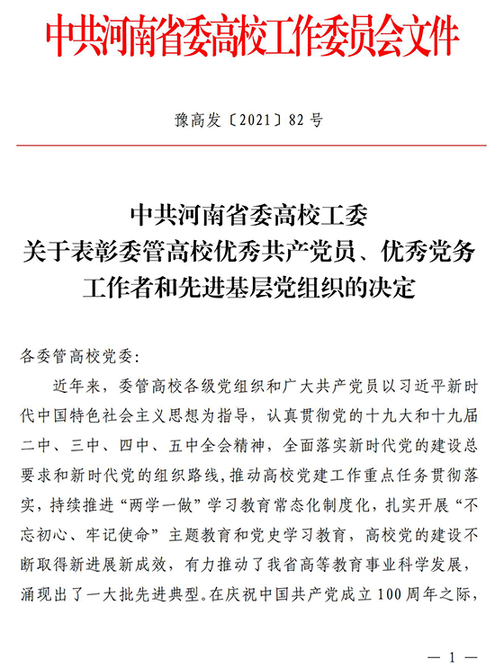 中共漯河食品职业学院经济管理系支部委员会,被授予“河南省高等学校先进基层党组织”荣誉称号!(详见:《中共河南省委高校工委关于表彰委管高校优秀共产党员、优秀党务工作者和先进基层党组织的决定》(豫高发〔2021〕82号)文件)