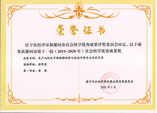 经济管理系主任曹源同志的研究成果《农产品批发市场规模经济与流通市场专业化的关系》,在漯河市第十一届社会科学优秀成果奖评选活动中荣获“特等奖”,填补了经济管理系在该活动中“特等奖”项目上的空白。... 阅读(1803)