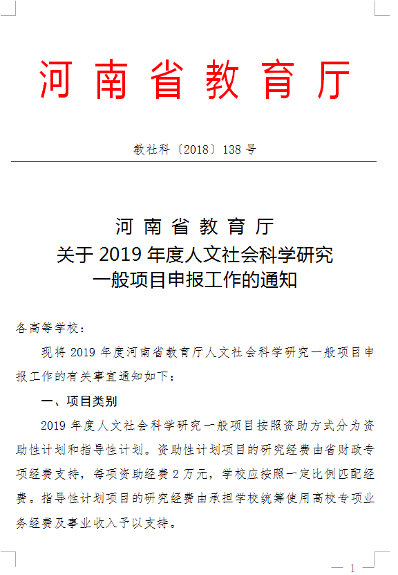 河南省教育厅关于2019年度人文社会科学研究一般项目申报工作的通知