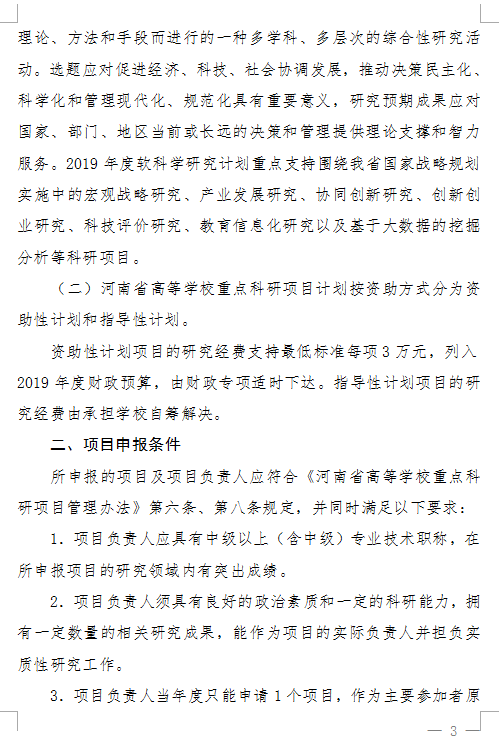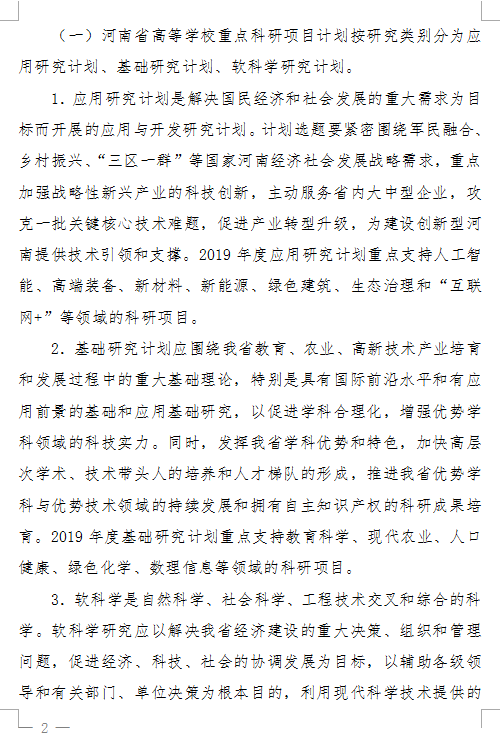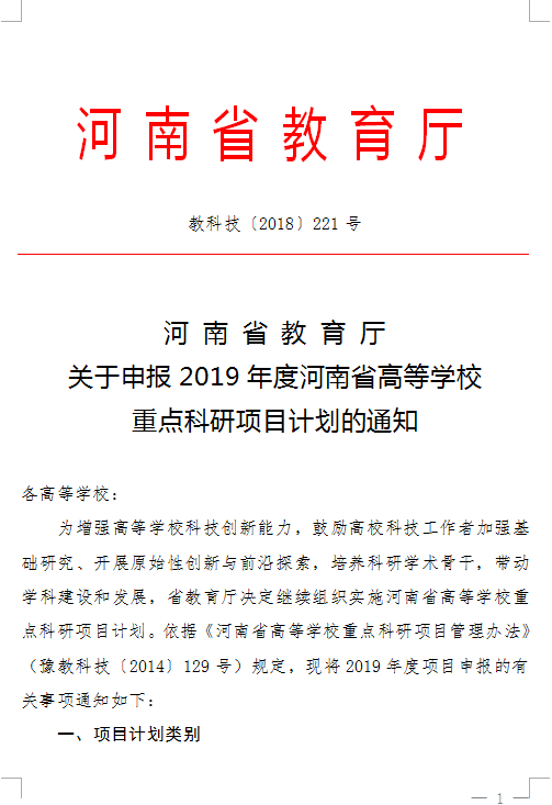 河南省教育厅关于申报2019年高校重点科研项目的通知文件