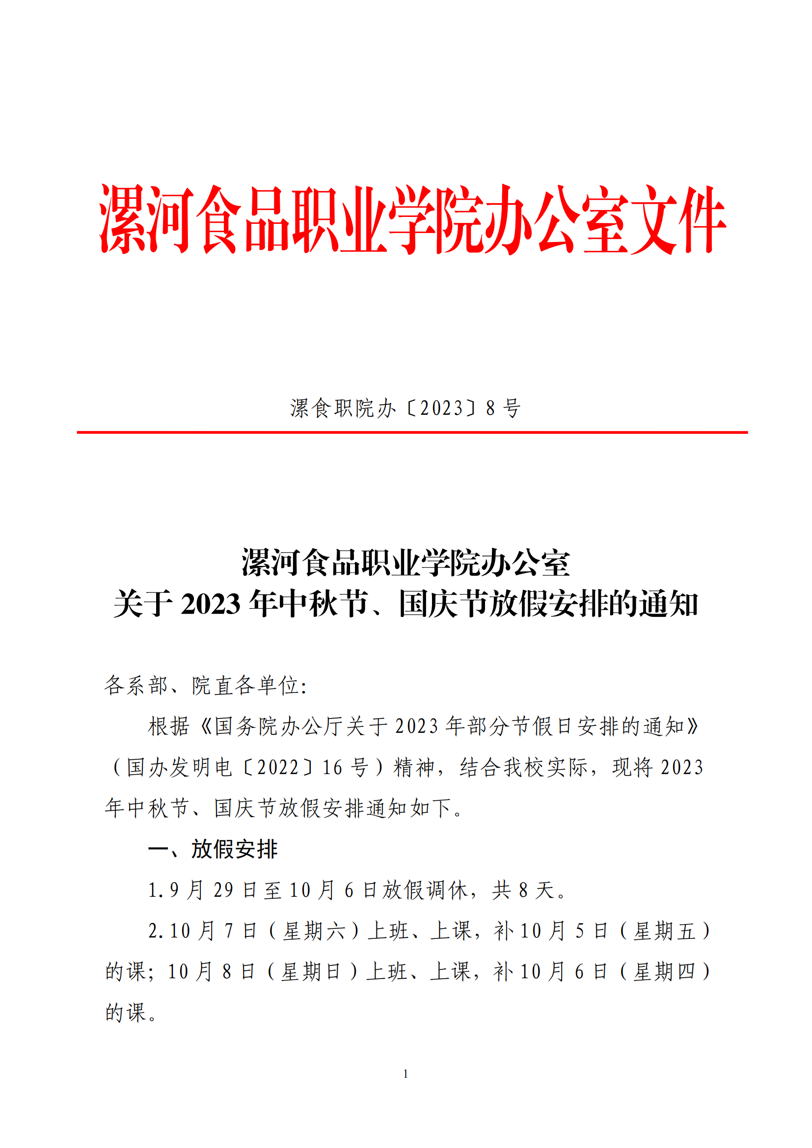 2023/09/27漯食职院办〔2023〕8号关于2023年中秋节、国庆节放假安排的通知