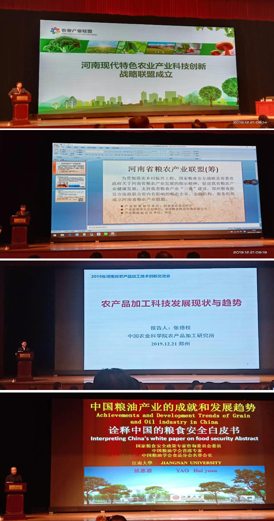 12月21日,由河南省农业农村厅、郑州大学、河南工业大学主办,河南省农科院农副产品加工研究所、郑州大学农学院、河南农业大学食品科学技术学院、中国粮油学会食品分会、河南省食品学会承办的2019年河南省农产品加工业技术创新交流会议在黄河迎宾馆顺利召开。河南省农业农村厅副厅长刘保仓、河南省农业农村厅党组成员、总农艺师王俊忠、国家“万人计划”科技创新领军人才、中国农业科学院农产品加工研究所副所长张德权等300余家单位、500余人参加会议。我院科技处处长、食品科学副教授周婧琦参加此次会议。