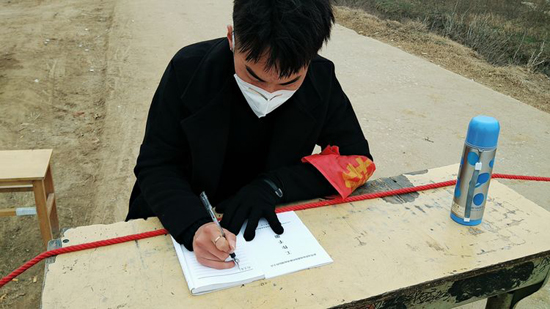 武汉疫情爆发之后,他积极响应共青团中央和河南共青团的号召,百般寻找志愿者途径,最终被安排在河南省泌阳县郭集镇主要交通路段进行防疫卡点志愿工作。虽然不能投身一线,但是作为一名青年团员大学生,他深知“国家兴亡,匹夫有责”,希望能通过志愿者的方式,为家乡,为国家奉献出自己的一份力量。