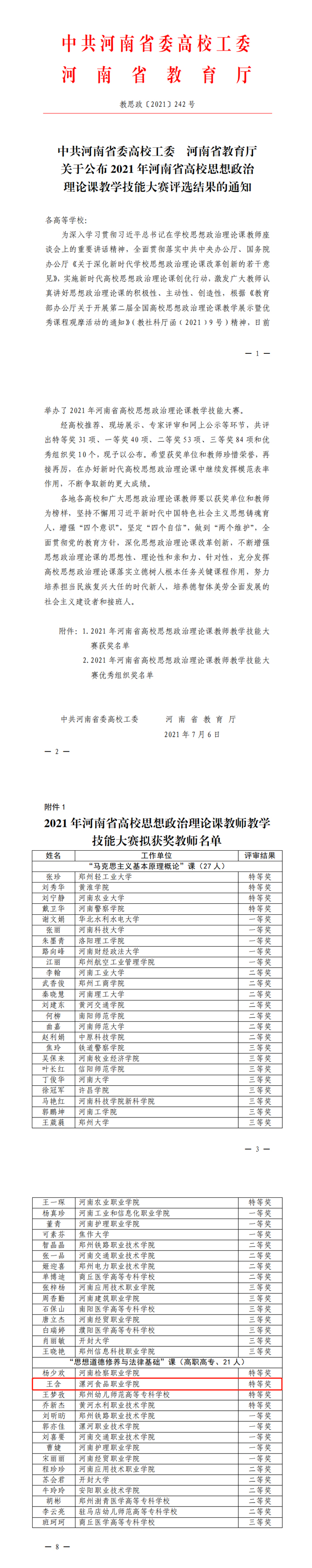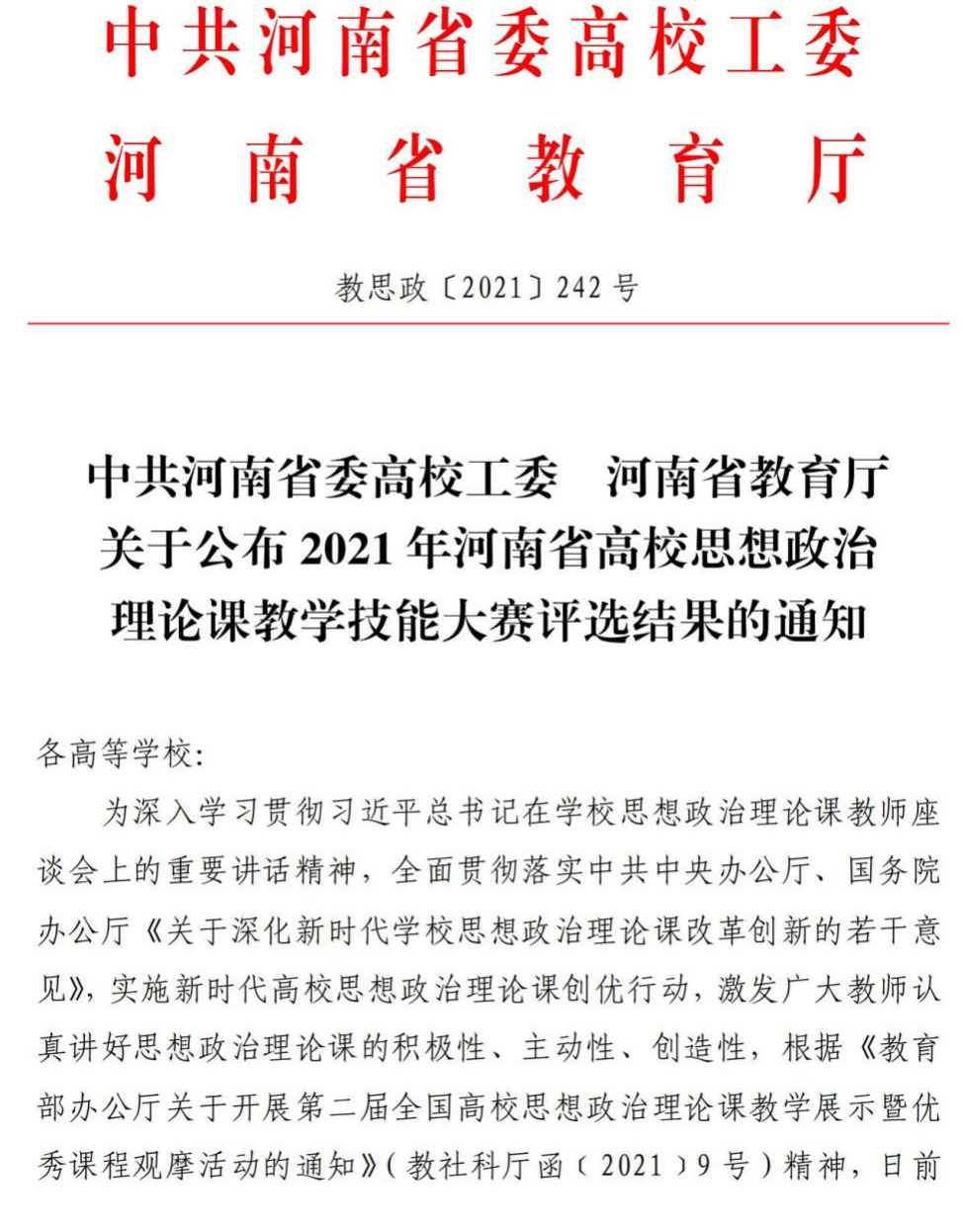喜报:我院荣获2021年河南省高校思政课教师教学技能大赛优秀组织奖,王含老师荣获河南省高校思政课教师教学技能大赛特等奖... 阅读(1215)