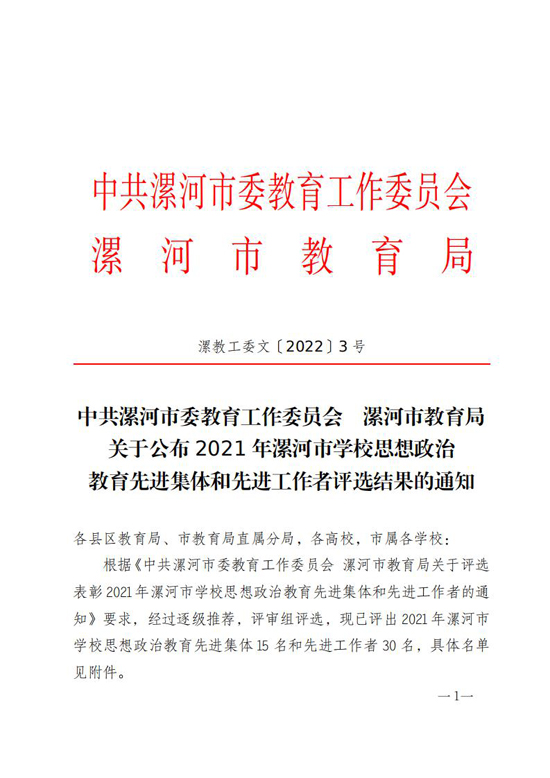 2022/02/17思政部王含同志获得2021年漯河市学校思想政治先进工作者