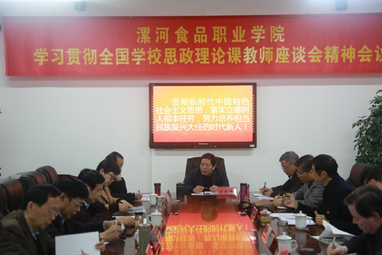 ——漯河食品职业学院学习贯彻习近平总书记在全国学校思政理论课教师座谈会上的重要讲话精神 3月22日,漯河食品职业学院召开学习贯彻全国学校思政理论课教师座谈会精神会议,学习贯彻习近平总书记重要讲话精神。学院党委书记詹跃勇、院长李五聚、院党政班子成员、各处室系部主要负责人、思政课教师代表共67人参加。 ...... 阅读(1087)