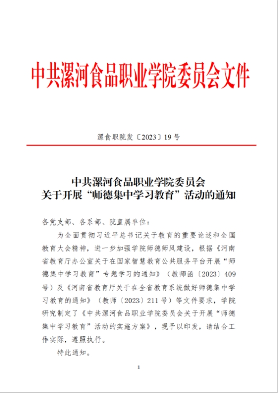 2023/07/20中共漯河食品职业学院委员会关于开展“师德集中学习教育”活动的通知