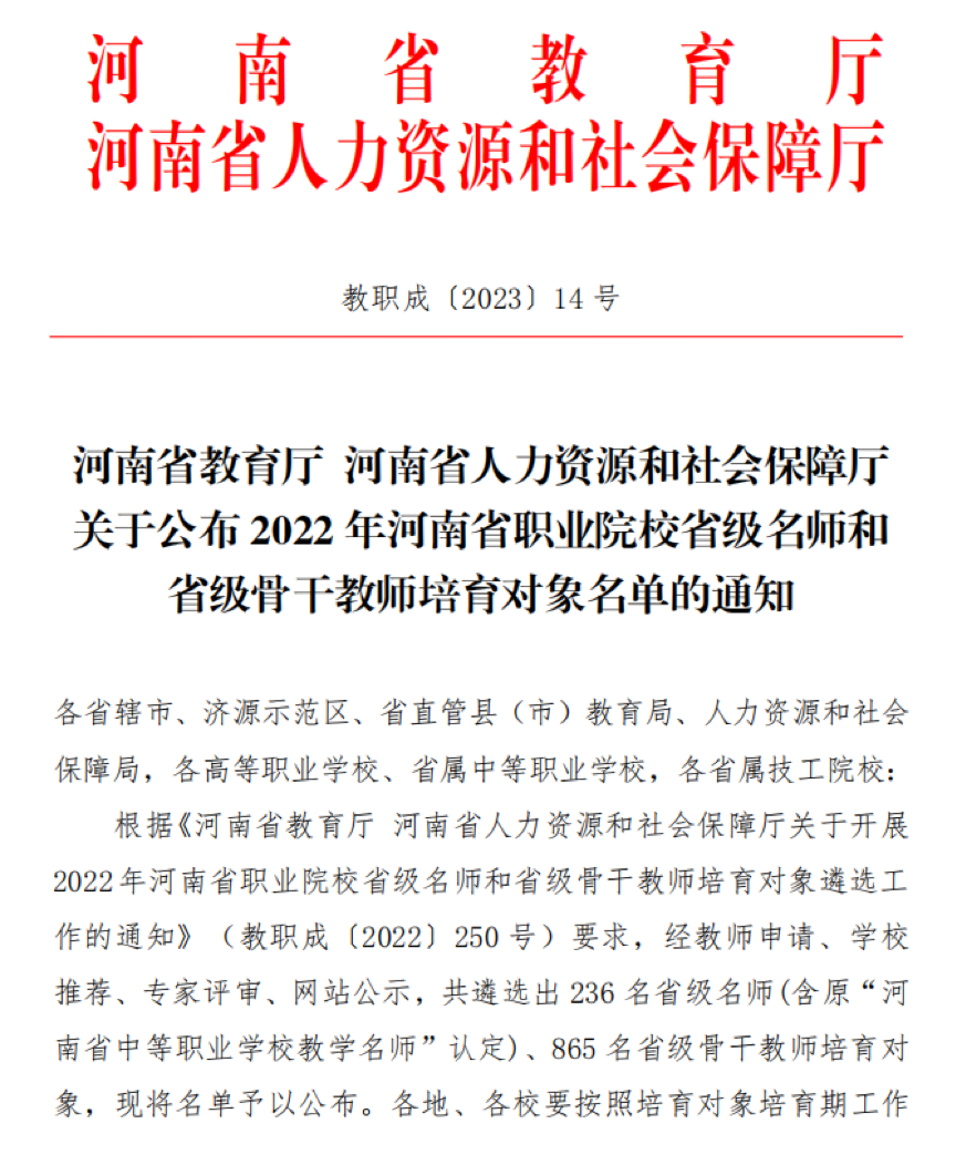 2023/02/09漯河食品职业学院多名教师被遴选为省级名师和省级骨干教师培育对象