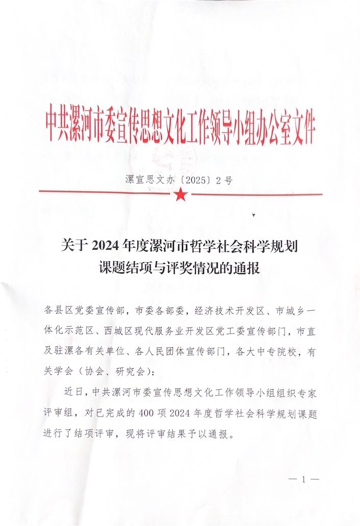 近日,中共漯河市委宣传思想文化工作领导小组办公室下发《关于2024年度漯河市哲学社会科学规划课题结项与评奖情况的通报》(漯宣思文办〔2025〕2号)。经中共漯河... 阅读(917)