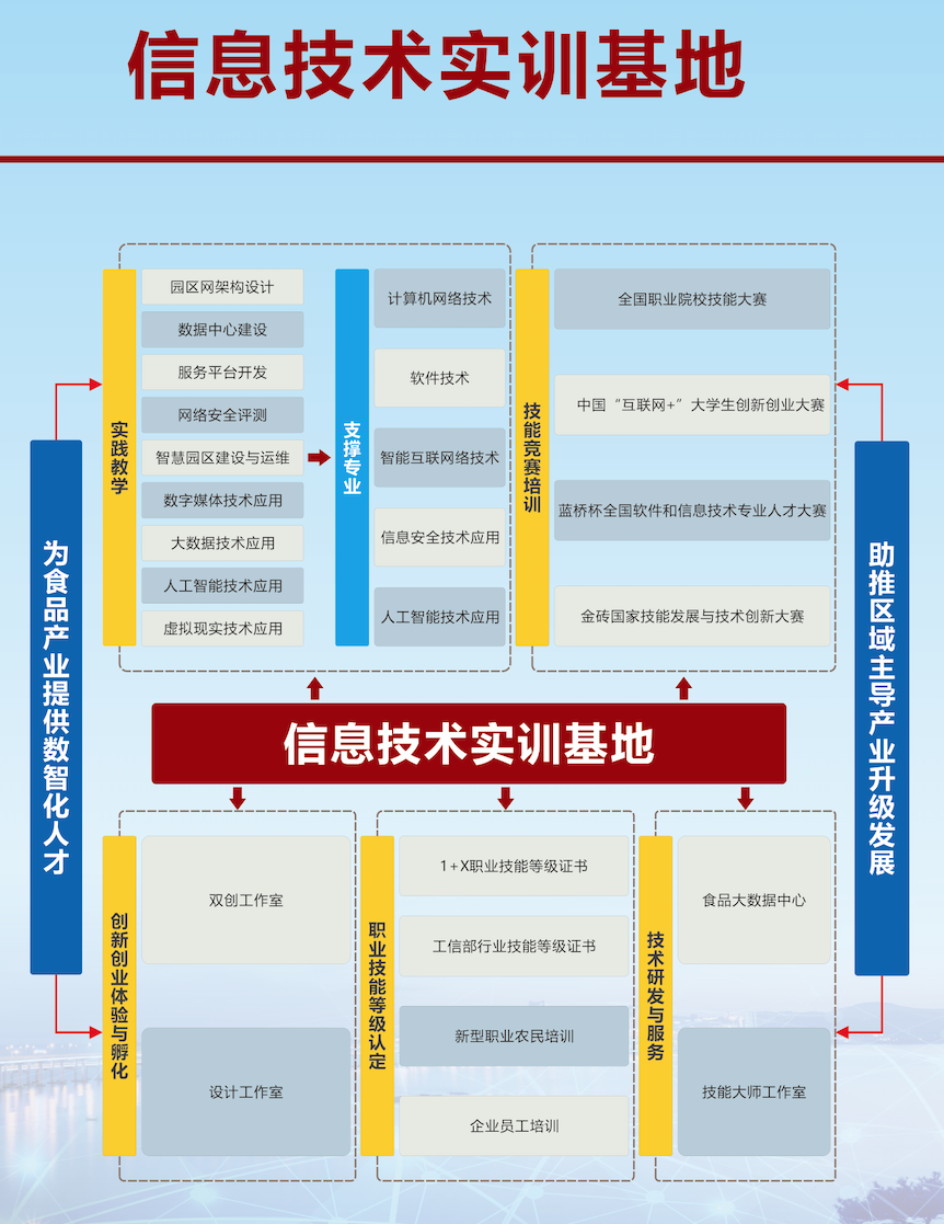信息技术实训基地是国家级高技能人才培养培训基地,总面积4620平方,各类实训设备2577台套,学生专业实训工位2154个,设备总价值1561万元。 基地积极推进 “产学研转创” 融合发展,与多家企业共同创建了能够满足园区网架构设计、数据中心建设、服务平台开发、网络安全测评、智慧园区建设与运维、数字...... 阅读(1238)