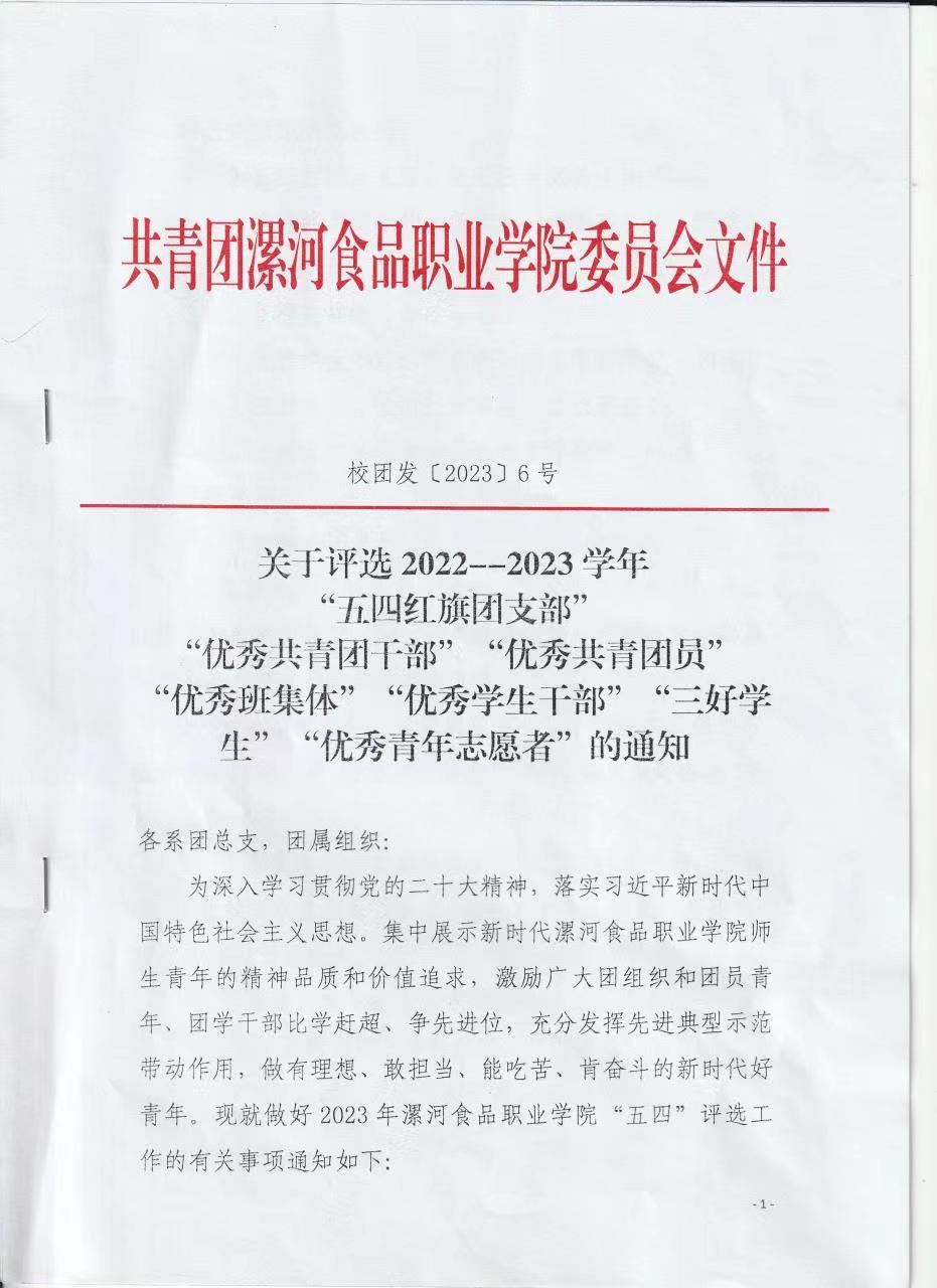校团发〔2023〕6号关于评选2022--2023学年“五四红旗团支部”“优秀共青团干部”“优秀共青团员”“优秀班集体”“优秀学生干部”“三好学生”“优秀青年志愿者”的通知 各系团总支,团属组织: 为深入学习贯彻党的二十大精神,落实习近平新时代中国特色社会主义思想。集中展示新时代漯河食品职业学院师生...... 阅读(1858)