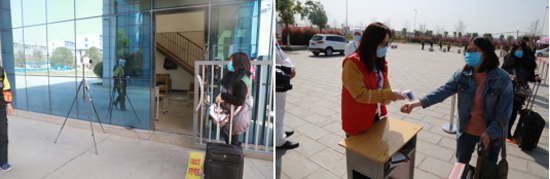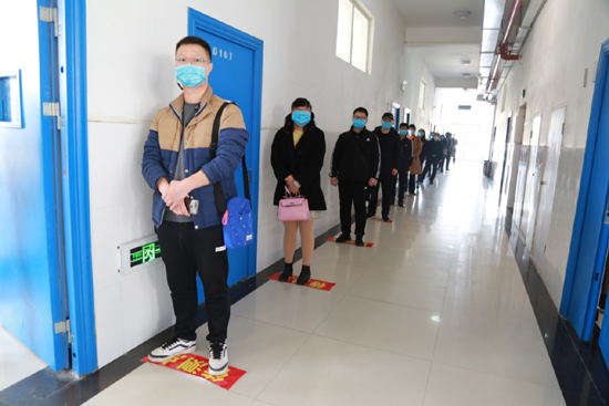 上课前学生有序等待测温入教室