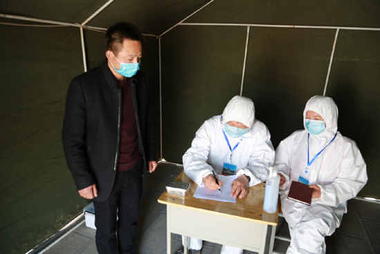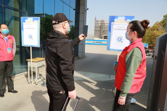 校门口临时隔离室医务人员对入校“发热”学生进行询问登记
