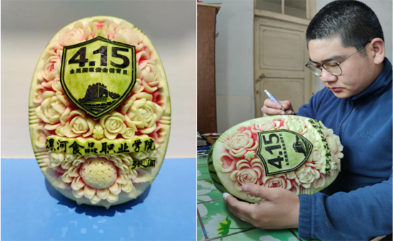 我院17级营养烹饪系学生张闯听完讲座后,拿起手中的雕刻刀,抱起大西瓜,完成他一直想完成的作业。他说:“疫情期间虽然不能到校做宣传,只能以这样的形式来表达我的心意。椭圆形的西瓜象征的是我们伟大的祖国,4.15标识下代表的是疫区,现在春天已来,百花争放,我深知取得的这一切胜利,都是因为我们的背后有一个从不言败,越挫越勇的党。”
