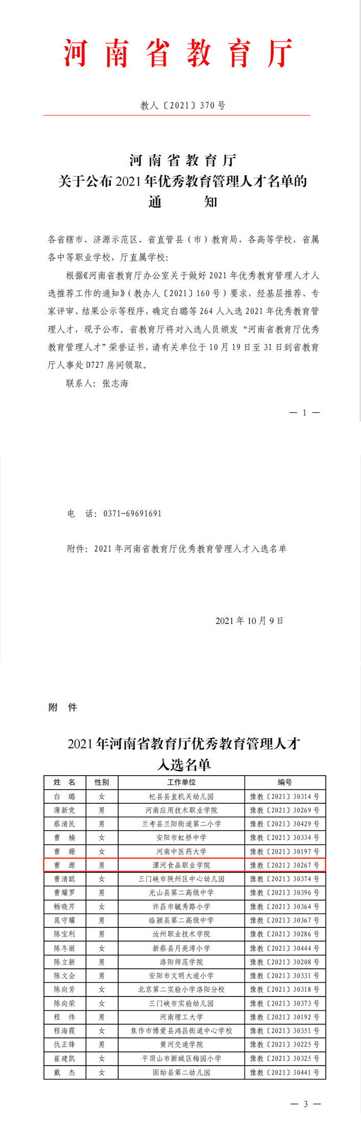 曹源入选河南省教育厅优秀教育管理人才名单